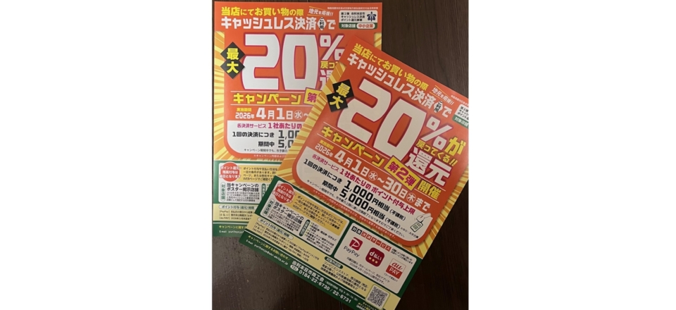 第2弾 2026年4月1日から4月30日まで、対象のキャッシュレス決済(PayPay、au PAY、d払い)で最大20%が還元されるキャンペーン開催中です。市内の対象中小店舗で最大20%が還元され、1回上限1,000円相当、期間合計5,000円相当まで還元されます。 キャッシュレス決済ポイント還元キャンペーン! ・ディポットオブヘアー ・フェイシャルサロンK